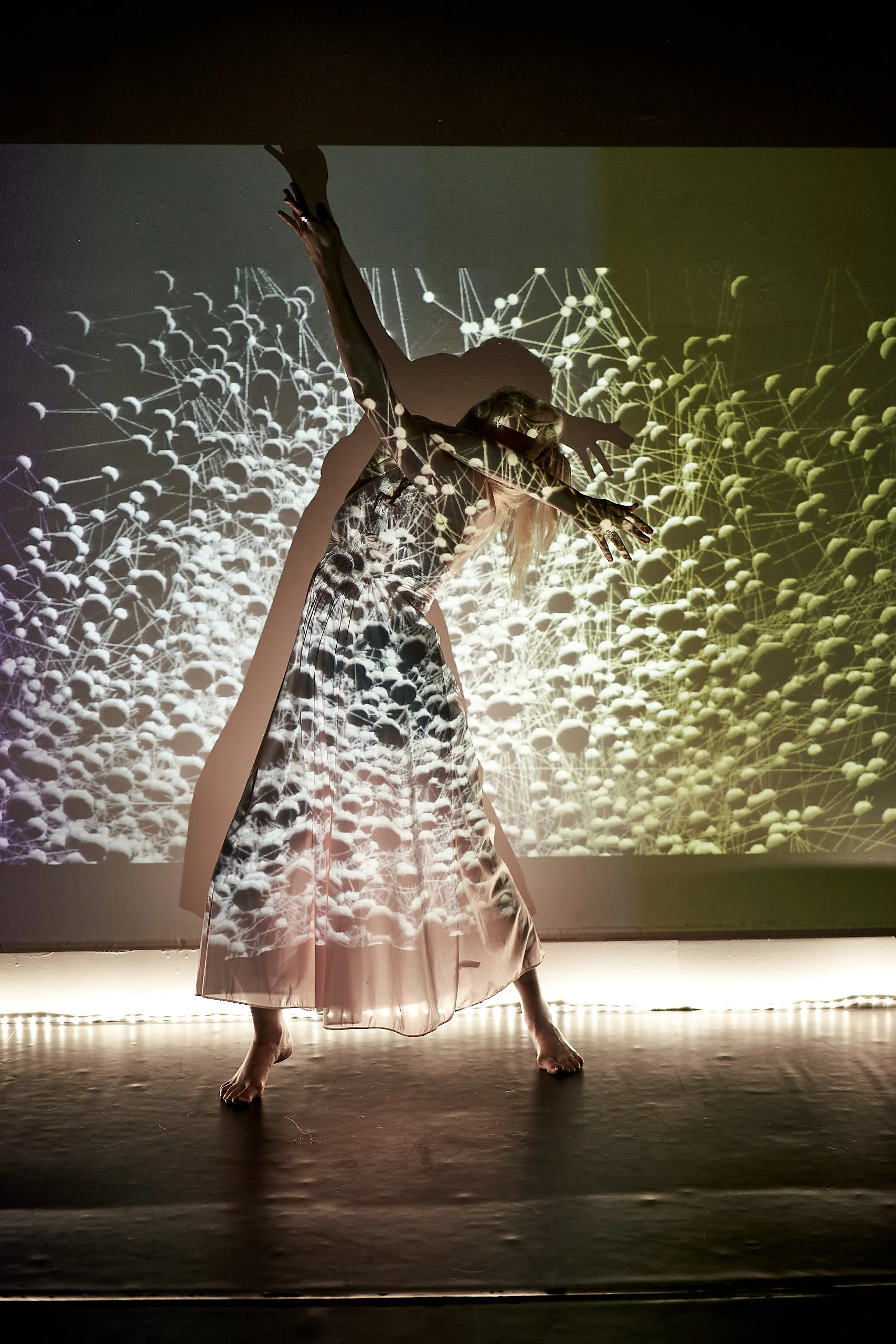 The piece features C4D projected visuals by VR artist Damien Blaise, an original score by composer Michael Quinn, and is choreographed and performed by Caroline Haydon.